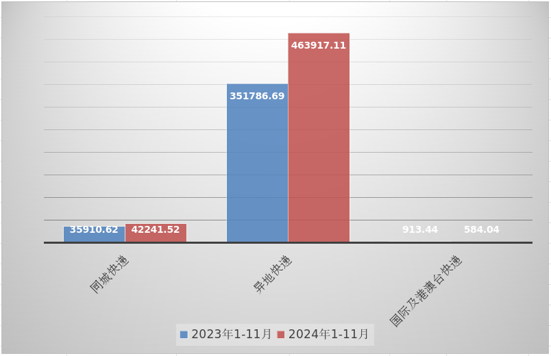 1-11月,全省同城快递业务量累计完成4.22亿件,同比增长17.63%;异地快递业务量累计完成46.39亿件,同比增长31.87%;国际/港澳台快递业务量累计完成584.04万件,同比下降36.06%。