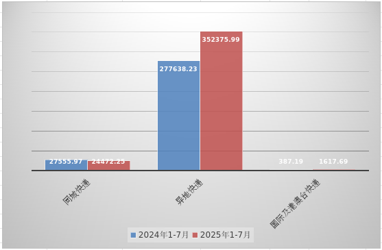 1-7月,同城快递业务量累计完成2.45亿件,同比下降11.19%;异地快递业务量累计完成35.24亿件,同比增长26.92%;国际/港澳台快递业务量累计完成1617.69万件,同比增长317.8%。