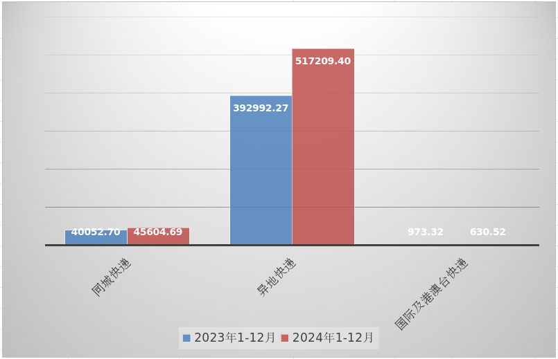 1-12月,全省同城快递业务量累计完成4.56亿件,同比增长13.86%;异地快递业务量累计完成51.72亿件,同比增长31.61%;国际/港澳台快递业务量累计完成630.52万件,同比下降35.22%。