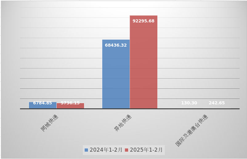 1-2月,同城快递业务量累计完成5736.15万件,同比下降15.46%;异地快递业务量累计完成9.23亿件,同比增长34.86%;国际/港澳台快递业务量累计完成242.65万件,同比增长86.22%。