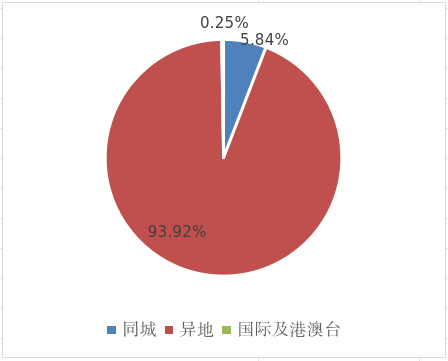 1-2月,同城、异地、国际/港澳台快递业务量分别占全部快递业务量的5.8493.920.25。与去年同期相比,同城快递业务量的比重下降3.17个百分点,异地快递业务量的比重上升3.09个百分点,国际/港澳台快递业务量的比重上升0.07个百分点。