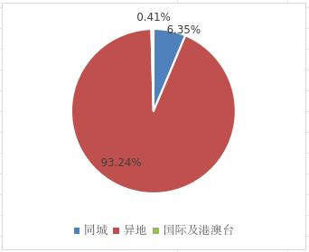 1-6月,同城、异地、国际/港澳台快递业务量分别占全部快递业务量的6.35%、93.24%和0.41%。与去年同期相比,同城快递业务量的比重下降2.76个百分点,异地快递业务量的比重上升2.48个百分点,国际/港澳台快递业务量的比重上升0.28个个百分点。