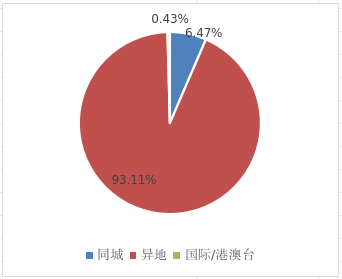 1-7月,同城、异地、国际/港澳台快递业务量分别占全部快递业务量的6.47%、93.11%和0.43%。与去年同期相比,同城快递业务量的比重下降2.55个百分点,异地快递业务量的比重上升2.25个百分点,国际/港澳台快递业务量的比重上升0.30个个百分点。